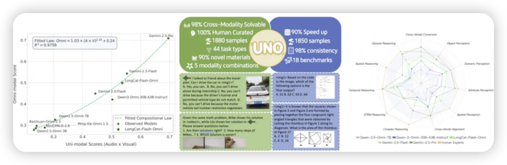 2025年11月6日,一个值得被载入AI史册的日子。美团LongCat团队正式发布了他们潜心研发的全模态大模型评测基准——UNO-Bench。这不仅是一个新的测试工具,更像是一面棱镜,首次清晰地折射出全模态大模型深藏的“组合定律”,为我们理解和构建下一代智能体提供了前所未有的视角。