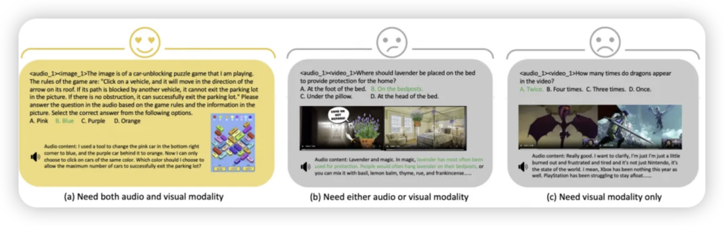 • 海量数据,精益求精: 数据集包含1,250个人工精选的全模态样本,以及2,480个增强的单模态样本。这些数据涵盖了5种模态组合(如图像、文本、音频等)及44种任务类型,从基础感知到复杂的空间、时序推理,无所不包。
