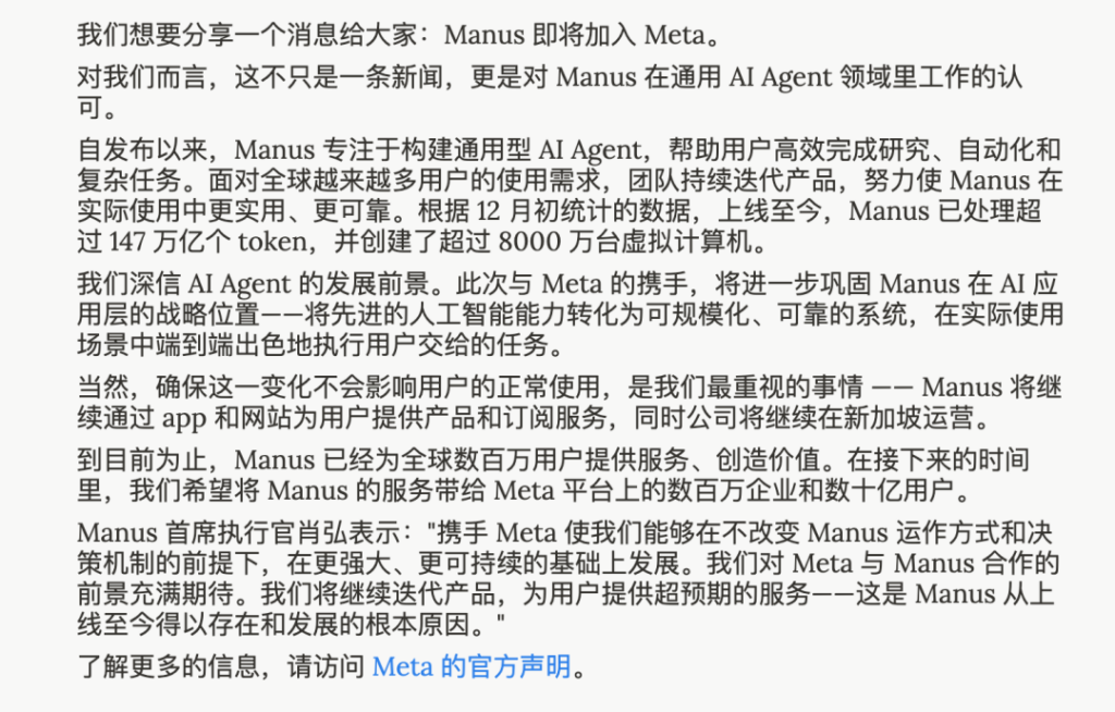 这无疑是一场双赢。Meta买到了通往未来的船票,Manus团队获得了顶级资源的支持。