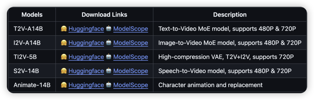• 代码与模型,一键下载:无论你习惯在GitHub上逛,还是偏爱Hugging Face的便捷,亦或是国内的魔搭社区 (ModelScope),Wan2.2-Animate的代码和模型权重都已经静候你的到来。