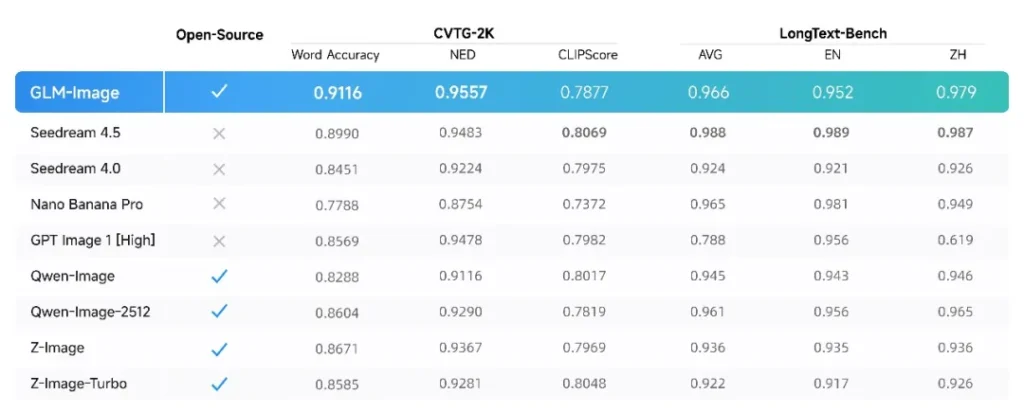 在权威的CVTG-2K测试中,GLM-Image的成绩相当吓人。它的归一化编辑距离(NED)达到了0.9557,平均单词准确率超过了91%。