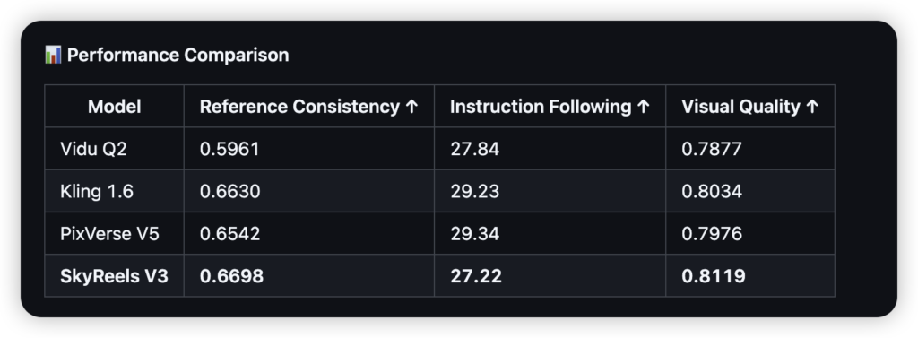 根据官方放出的硬核评测数据,在“参考一致性”这一指标上,SkyReels-V3拿到了0.6698的分数。为了让你对这个数字有概念,目前市面上的商业强手Vidu Q2得分是0.5961,而备受好评的Kling 1.6则是0.6630。也就是说,在保持人物长得像、衣服不乱变这件事上,这个开源模型已经略微领先了第一梯队的商业闭源模型。