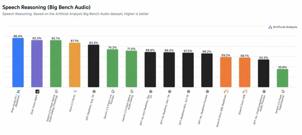 在全球权威的 Artificial Analysis Speech Reasoning 评测中,Step-Audio-R1.1 拿下了 96.4% 的准确率。这个数字意味着什么?意味着它直接登顶榜首,把大名鼎鼎的 Grok、Google 的 Gemini,甚至是 OpenAI 的 GPT-Realtime 都甩在了身后。