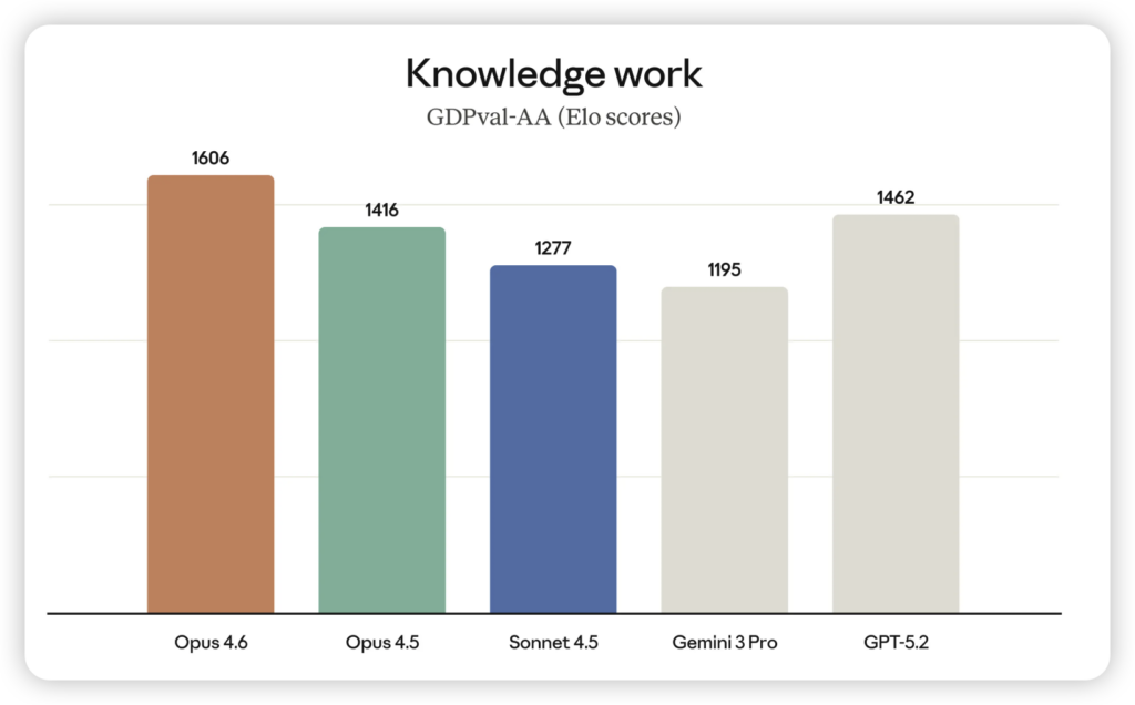 在针对高价值知识工作的 GDPval-AA 基准测试中,Opus 4.6 拿到了 1606 分,而它的老对手 GPT-5.2 只有 1462 分。这意味着在金融、法律这种真的能赚钱的领域,Opus 4.6 的胜率高达 70%。