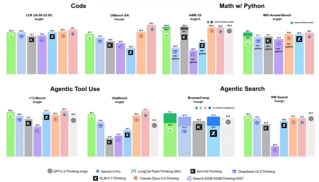 现在的大模型,做数学题只是基本功,能不能熟练使用工具、搜索信息、解决实际问题才是落地的关键。美团官方披露,在依赖工具调用的随机复杂任务中,LongCat的表现超越了Claude-Opus-4.5-Thinking。