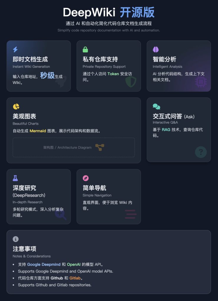 DeepWiki 的核心理念超酷:用 AI 和自动化,把你的代码仓库变成一份活的、会呼吸的、随时更新的 Wiki 文档! 你只需要给它一个 GitHub 或 GitLab 仓库地址,剩下的,它用魔法帮你搞定!