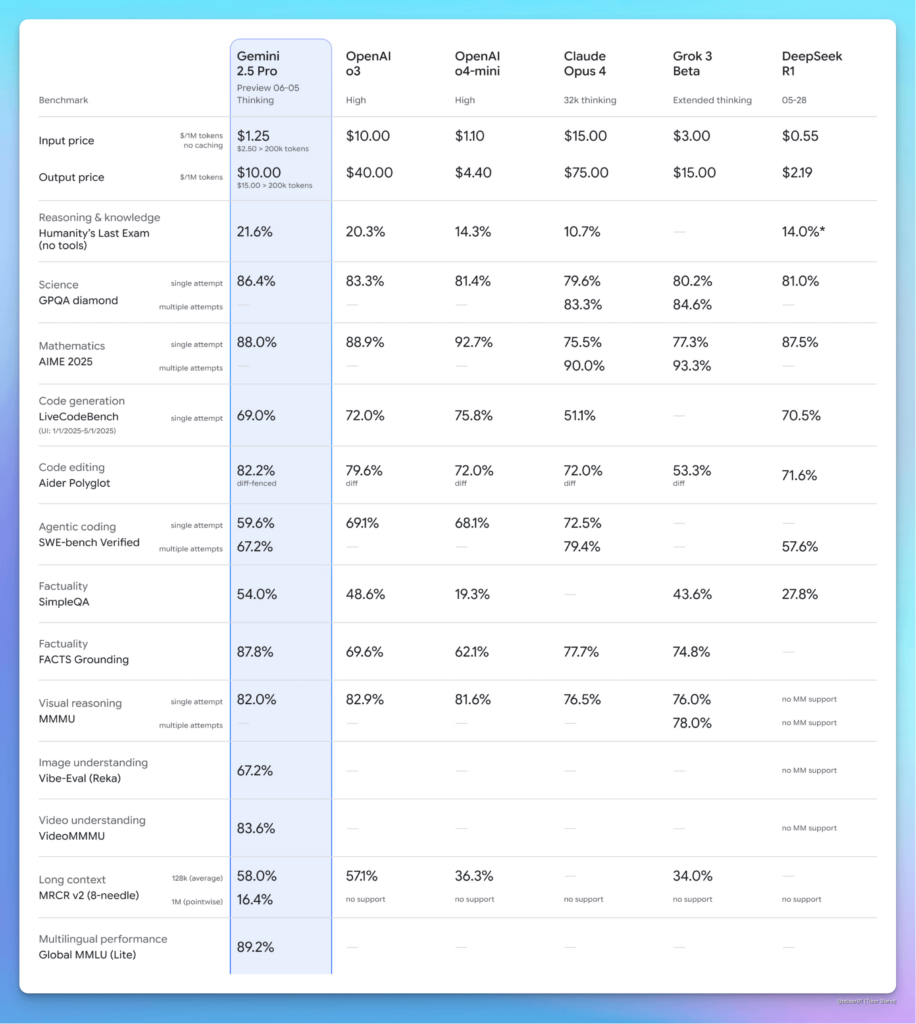 数据不会说谎,Gemini 2.5 Pro 06-05在多项基准测试中展现出断层领先的实力: