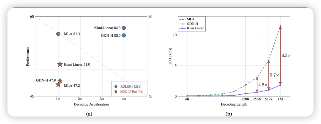 而最令人振奋的,莫过于其在长文本处理上的效率表现。当需要处理100万token的超长上下文时,Kimi Linear的解码吞吐量达到了传统全注意力模型的6倍!这意味着,原本需要漫长等待才能处理的浩瀚文本,现在可以瞬间得到响应。即使是512k长度的序列,速度也提升了2.3倍。想象一下,一整本小说的解析,不再需要漫长的加载,而是眨眼之间完成。