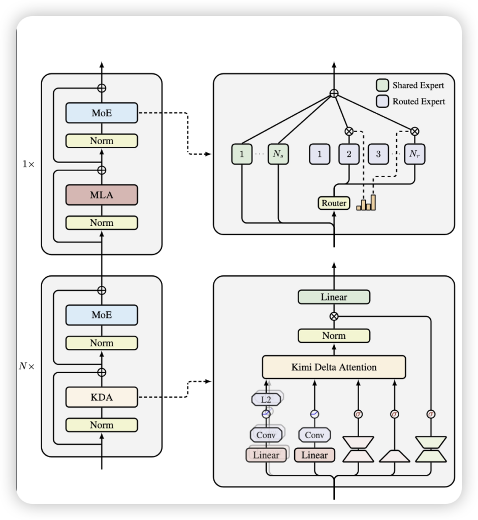 首先,是其灵魂所在——Kimi Delta Attention (KDA)。你可以想象它是一位极其挑剔的图书馆管理员,面对浩如烟海的信息,它不再是简单地选择记住一整本书或完全遗忘,而是能精细到每一个句子、每一个词语,为其设置独立的“遗忘率”。这项源于Gated DeltaNet的改进,引入了通道级对角门控机制,赋予模型对记忆前所未有的细粒度控制力。这意味着,模型能更智慧地取舍,高效地利用有限的计算资源,让每一寸“记忆”都物尽其用。